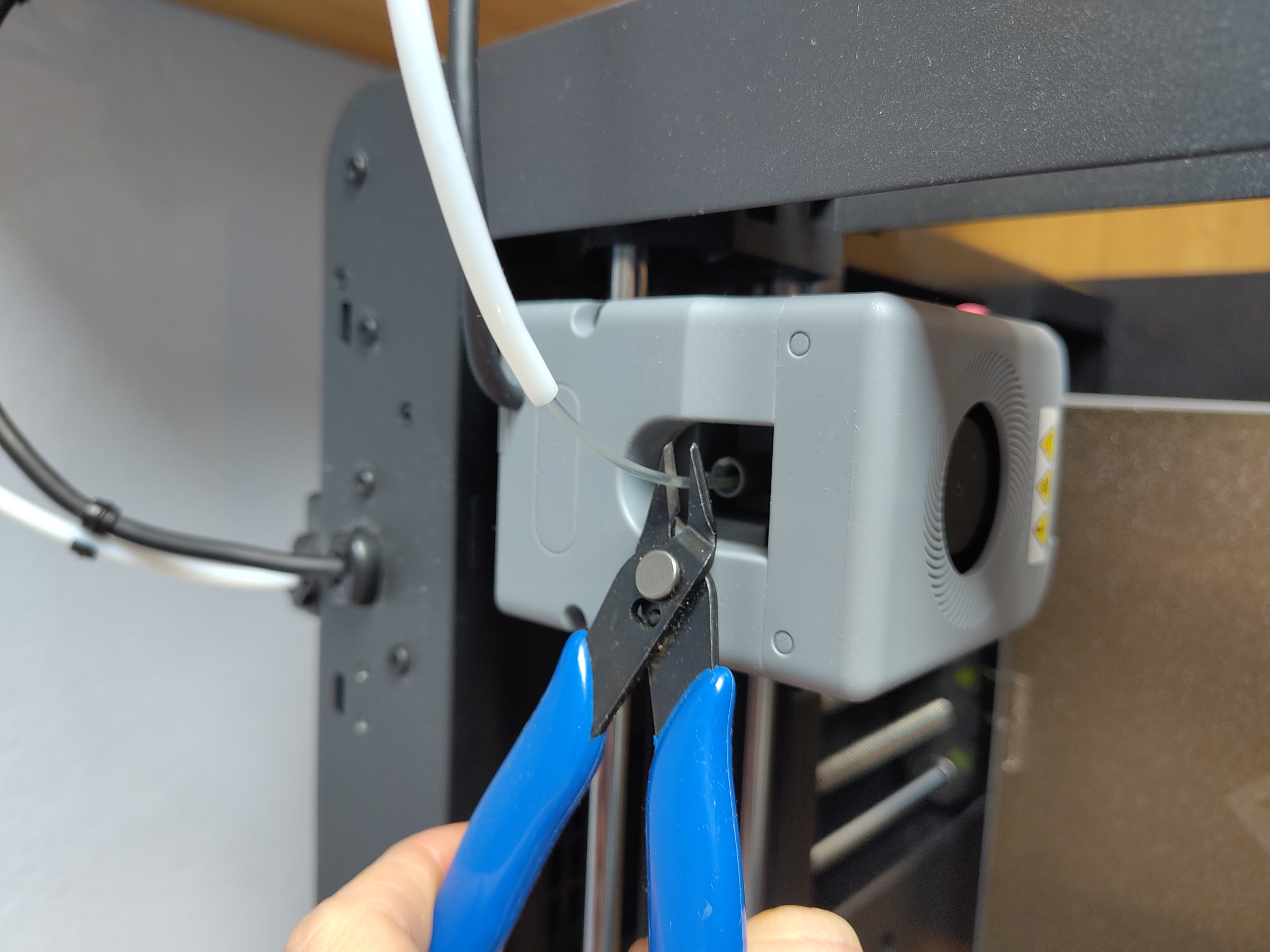 Knip je filament af vlak bij de extruder, vaak loopt je filament door een zogehete bowden-tube heen. Deze kun je omhoogschuiven van de extruder. De extruder is de printkop, de plek waar het filament naar binnen gaat via de bowden-tube kun je afknippen.